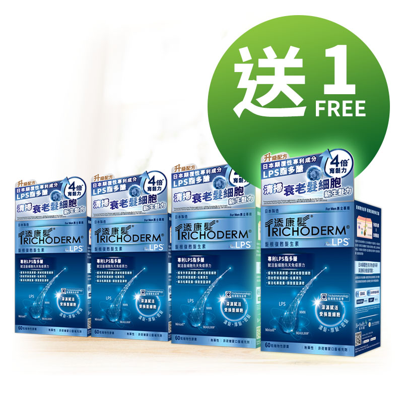 添康髮®髮根復甦髮生素男士專用是新一代的口服育髮補充品,嶄新育髮配方含專利及經臨床驗證的LPS(脂多醣)、Miricell™(大米胚芽亞精胺)及NMN,啟動恆菁免疫髮根復甦三原力開關: