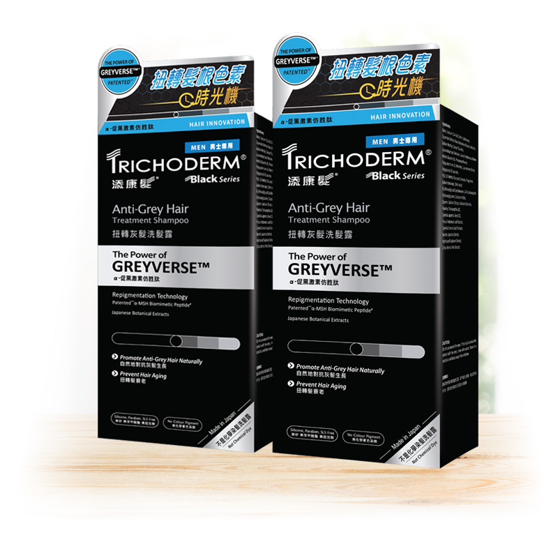 透過專利GREYVERSE™α-促黑激素仿胜肽的逆轉灰髮色素再生效能,添康髮®黑色系列系列男士專用扭轉灰髮洗髮露可以幫助對抗頭髮老化,自然地對抗灰髮。